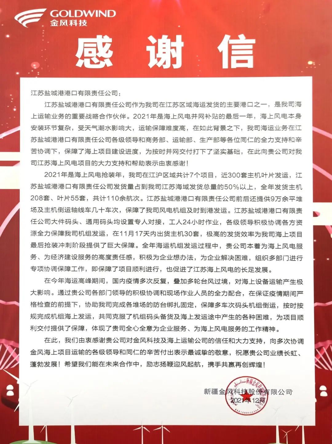 金风科技是盐城港大丰港区风电产业的重要合作伙伴,根据协议,双方将在2022年围绕风电设备内外贸易等领域开展合作,进一步助力集团特色风电产业港发展迈向新格局。
