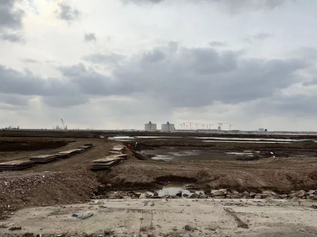 滨海港区主港池北区通用码头三期工程项目现场,一边是已开工作业的国家电投集团协鑫滨海发电有限公司,一边是联排的挖掘机紧张施工。