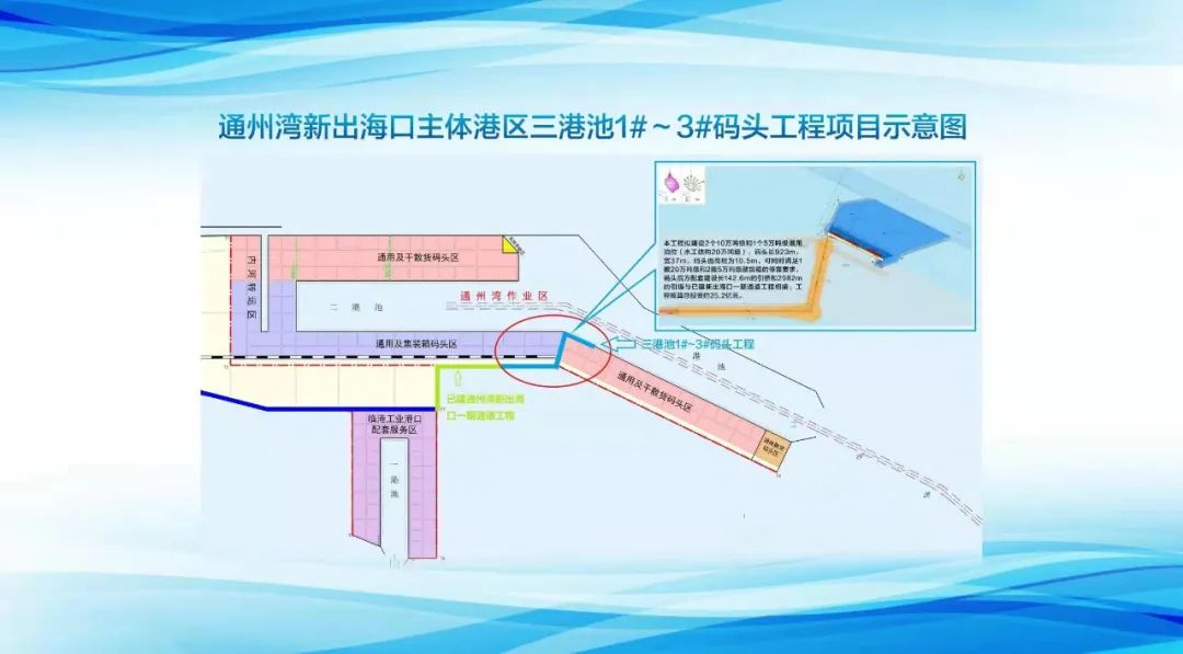 去年底,通州湾新出海口主体港区三港池1#—3#码头开工,项目可满足沿江、沿海产业对大型码头中转的迫切需求。南通港集团建设投资有限公司副总经理尹进军表示,到2025年,以服务长江经济带集装箱等货物中转运输和临港工业并重的新出海口初步建成,港口设施能力进一步提升、服务功能进一步健全、集疏运体系进一步完善。