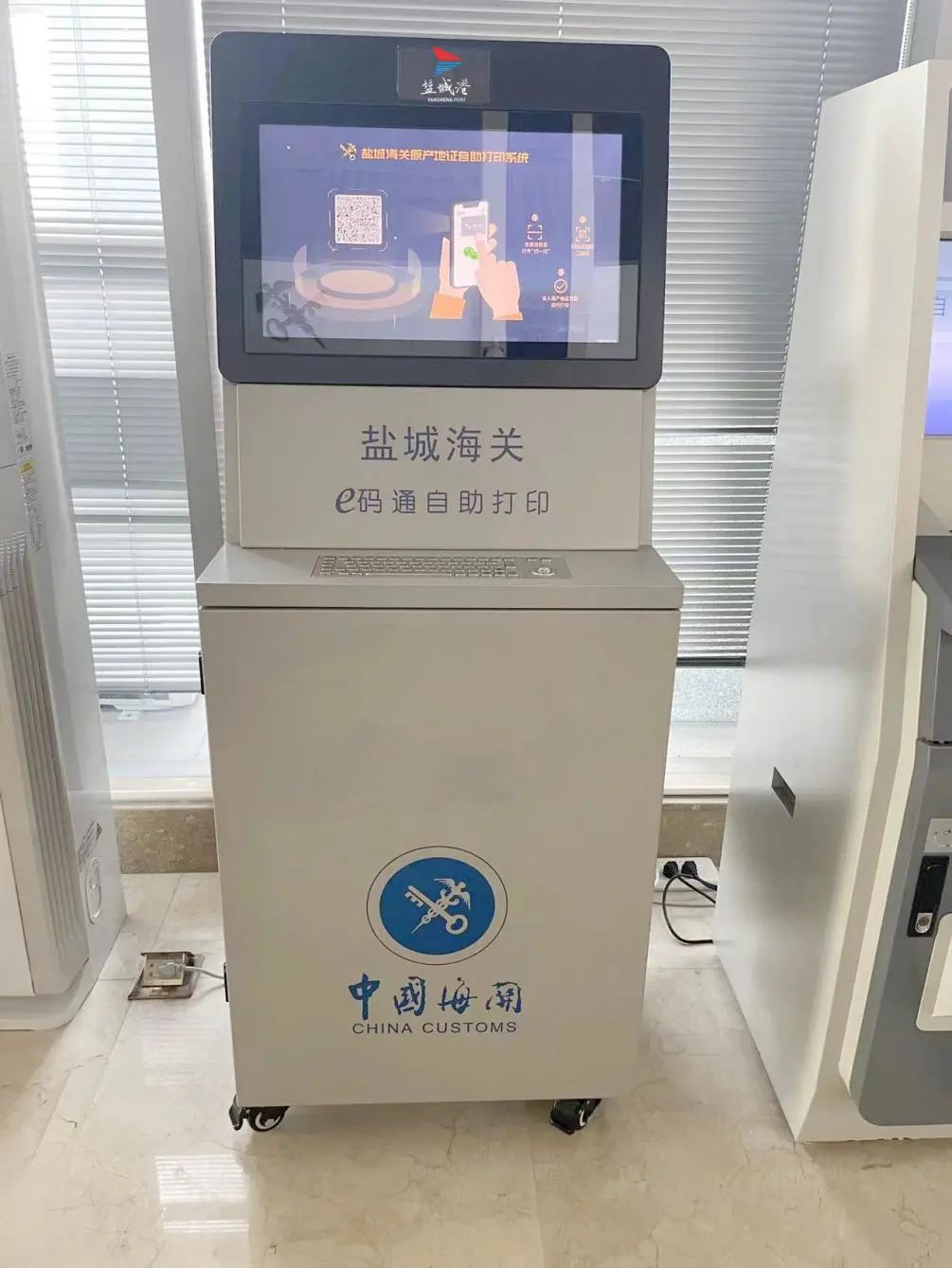 疫情防控期间,盐城港提供了2台原产地打印一体机,一台安装于盐城综合保税区1楼报关大厅,一台安装于盐城海关驻大丰港办事处,服务盐城所有进出口外贸企业原产地证自助打印,减轻现场窗口作为密集场所的防疫压力,为企业提供便捷高效的线上服务。