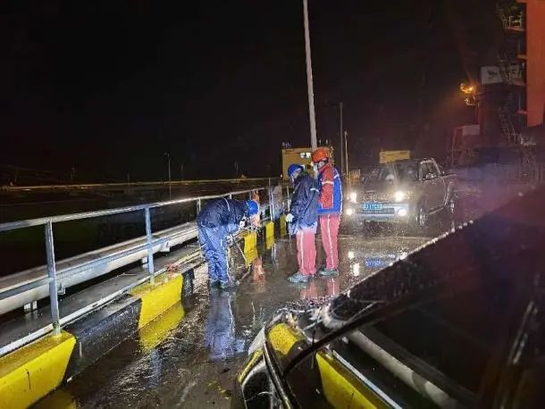 为了保障滚装作业顺利完成,粮食码头分公司检修人员以车灯为照明,冒着大风大雨检修线路。