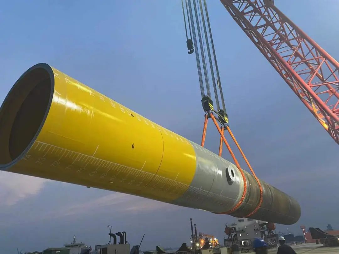 5月28日,盐城港响水港区小蟒牛作业区公用重件码头现场一派繁忙景象,由公用重件码头后方陆域打砂除锈喷涂并进行拼接组装的首件风电桩基,通过自行模块车运输至码头前沿。该件总长75米、直径8米、总重达1055.1吨,由1100t-51m巨无霸固定桅杆吊稳稳吊起,缓缓地放置在驳船搁置梁上,出海驶向渤海风电建设现场。