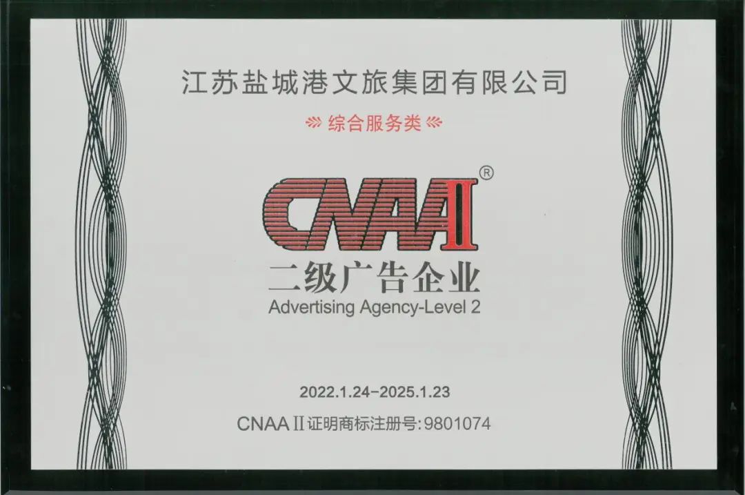 在海角社区 上下喜迎集团成立两周年之际,6月13日,文旅集团从中国广告协会收到一份沉甸甸的贺礼——编号9801074“CNAAII”综合服务类二级广告企业资质牌匾。这是目前盐城地区唯一一家通过综合服务类二级广告企业资质等级认定企业,标志着盐城港文旅集团资质创建取得了新的突破,为海角社区 成立两周年交出了一份亮眼的生日贺礼。