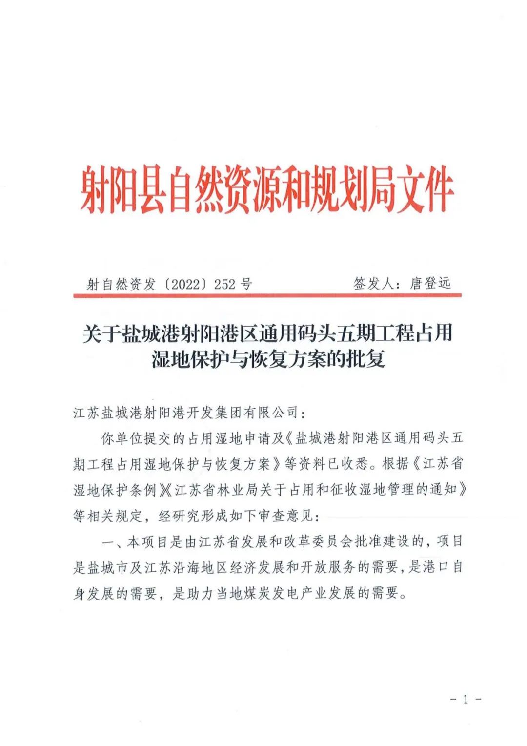 10月25日,盐城港射阳港区通用码头五期工程占用湿地保护与恢复方案取得射阳县自然资源和规划局正式批复,至此,该项目已完成包括备案、稳评、岸线批复等多项前期手续办理,为加快推进该项目的正式开工奠定了坚实基础。