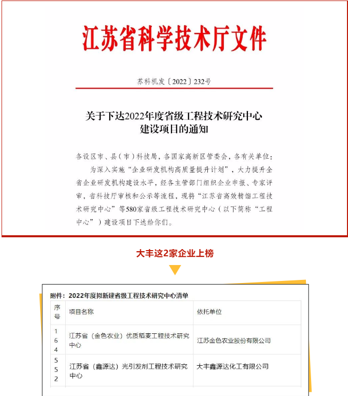 近日,江苏省科技厅公布了2022年新建省级工程技术研究中心名单,盐城港金色农业股份公司的《江苏省(金色农业)优质稻麦工程技术研究中心》项目成功入选。
