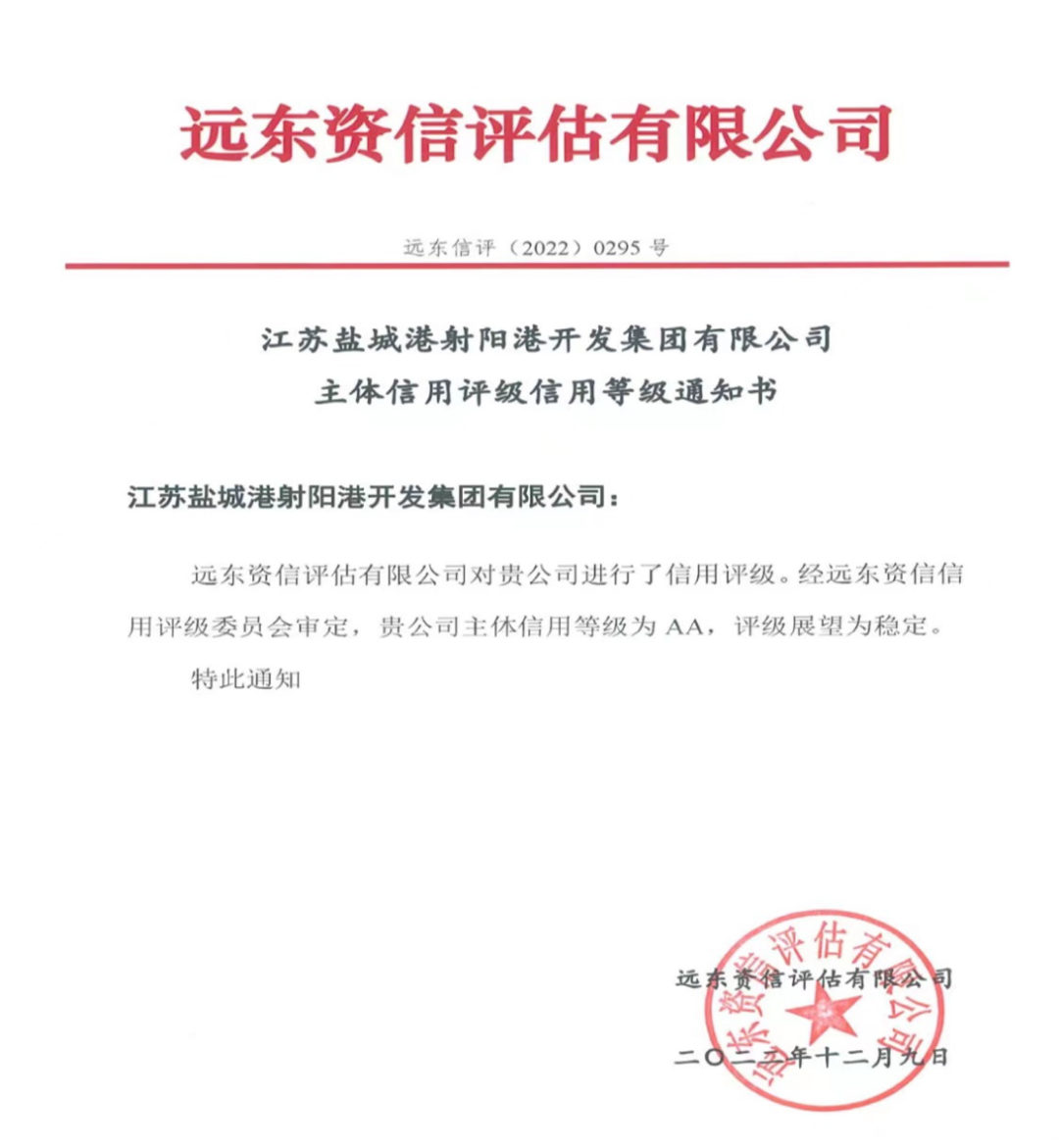 近期,经远东资信信用评级委员会审定,江苏盐城港射阳港开发集团有限公司成功获得AA级主体信用评级,评级展望为稳定。