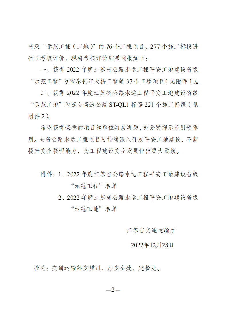 近日,省交通运输厅发布2022年度全省公路水运工程平安工地建设省级“示范工程(工地)”考核评价结果,灌河口5万吨级航道整治工程2个疏浚标段获评2022年度江苏省公路水运工程平安工地建设省级“示范工地”。