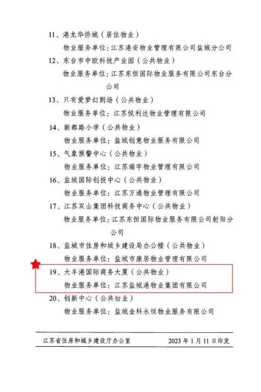 近日,江苏省住房和城乡建设厅公布2021年度省级示范物业管理项目名单,“盐城港大丰港国际商务大厦(公共物业)”被评价为“2021年度省级示范物业管理项目”,该项目由盐城港物业集团有限公司提供管理服务,该荣誉是江苏省物业管理行业省级最高荣誉。