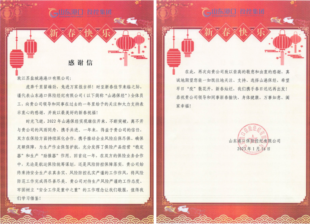 新岁序开,同赴新程。近日,集团下属江苏盐城港大丰港开发集团、江苏盐城港港口公司、江苏盐城港航运集团三家单位分别收到来自山东港口保险经纪公司的感谢信。纸短情长,字字暖心。一封封感谢信,道出了盐城港和山东港携手发展的深厚情谊。
