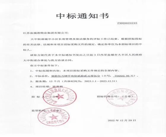 拓市场,保增长,项目业绩创一流。实业集团在提升物业服务质量、房屋租赁水平,扩大海角社区 “内循环”的同时,逐步向外部市场拓展。1月,黄海港城公司与中天大丰电缆有限公司成功签订员工宿舍租赁存量住宅业务合同,合同金额近30万元。物业公司成功中标大中街道城中小区长效管理及保洁服务,中标价约75万元。
