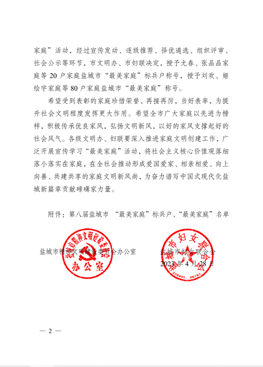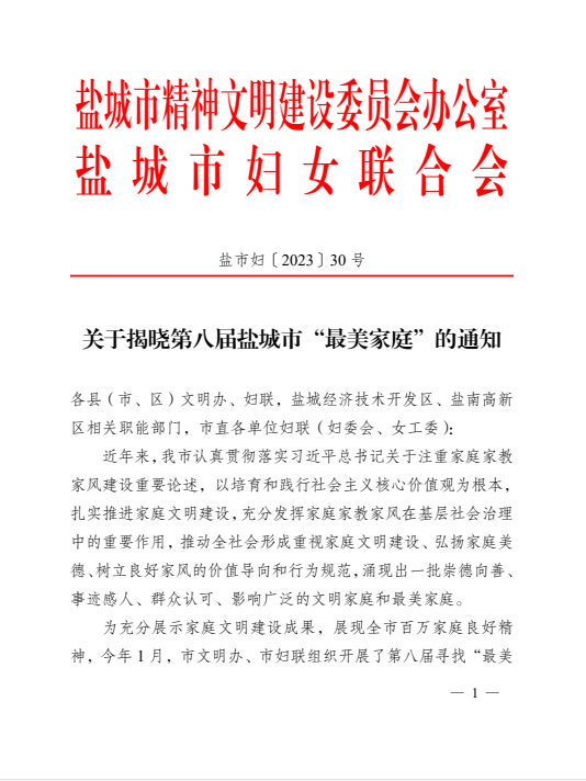 近日,从盐城市妇女联合会传来好消息,在市第八届盐城市“最美家庭”评选活动中,盐城港响水港区曾军家庭荣获盐城市“最美家庭”称号。