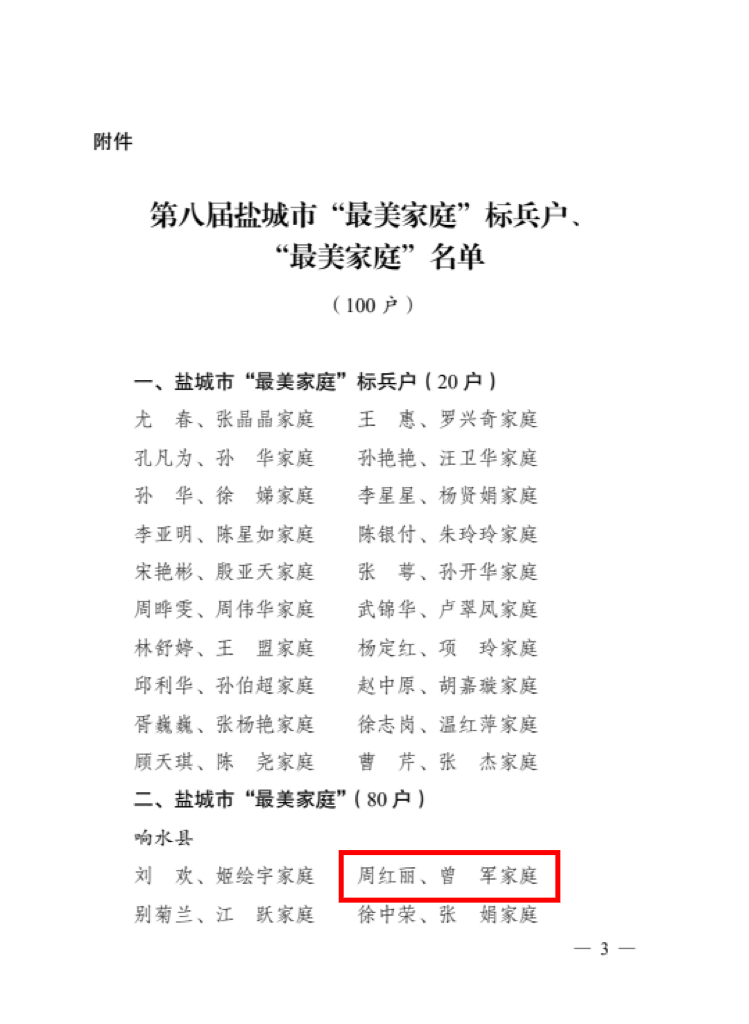 盐城港响水港区曾军家庭荣获盐城市“最美家庭”称号