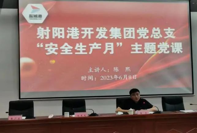 为切实发挥各级党组织和广大党员在安全生产中的战斗堡垒作用和先锋模范作用,近日,射阳港区党总支根据近年来习近平总书记关于安全生产的重要论述,结合港区安全风险点,为全体员工和驻港单位上了一堂安全生产主题党课,要求与会人员强化防范措施,在狠抓工作落实的同时,严格统筹发展和安全。