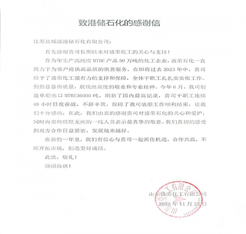 今年以来港储石化公司全体干部职工坚持以“时间就是金钱,程序体现规矩,质量铸就精品,效率就是生命”为宗旨,不断提升服务品质及工作效率,获得了客户的赞赏与肯定。近期,合作客户山东玉皇盛荣化工寄来一封感谢信,信中内容充分肯定了港储石化的服务品质,并由衷地表达了感谢。