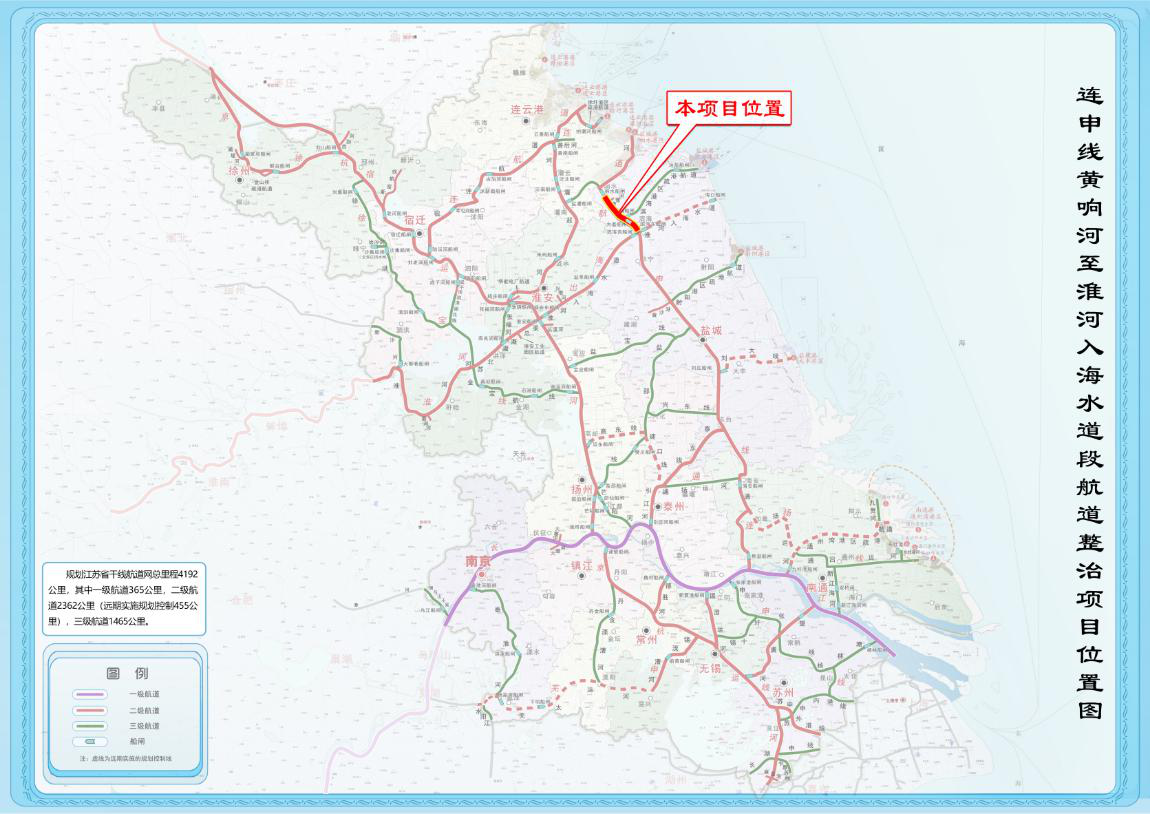 据了解,连申线黄响河至淮河入海水道段航道整治工程,起自黄响河与通榆河交汇处,讫于淮河入海水道与通榆河交汇处,全长33.95公里,整治里程30.64公里,按二级航道标准建设,设计最大船舶吨级为2000吨级,通航水深不小于4米。新建大套二线船闸1座,改建桥梁6座,原规模改建废黄河地涵1座(含北排闸)。投资估算40.83亿元,建设工期4年。