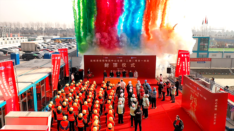 1月12日上午,盐城港保税物流中心在建项目仓储(二期)一标段C1、C2仓库迎来主体封顶的喜庆日子,为项目2024年顺利竣工奠定了基础。