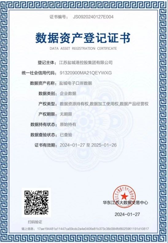 日前,盐城电子口岸系统通过数据资产质量评价及价值评估,评估值达910万元,并获得《数据资产登记证书》,成为全国首个电子口岸系统数据资产入表案例。