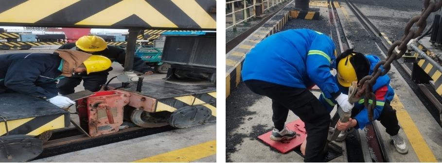 是班组长、是设备保障员,也是党员。“我是党员我先上”是我们每个人的行为准则。寒潮来临前,他们仔细检查门机锚定插板、防风拉锁、防爬器、铁楔是否完全插入槽内;利用加杆检查链条连接环是否受力至最大值;严格检测防爬器是否落地牢靠;确保恶劣天气下港区安全有序。