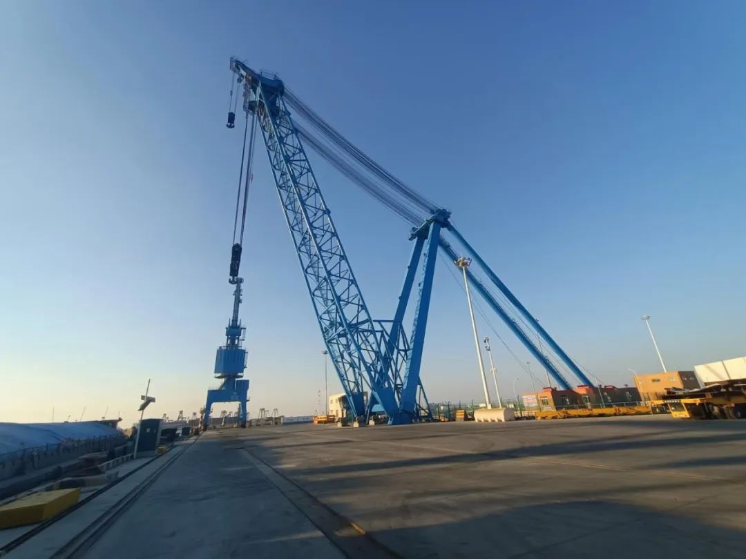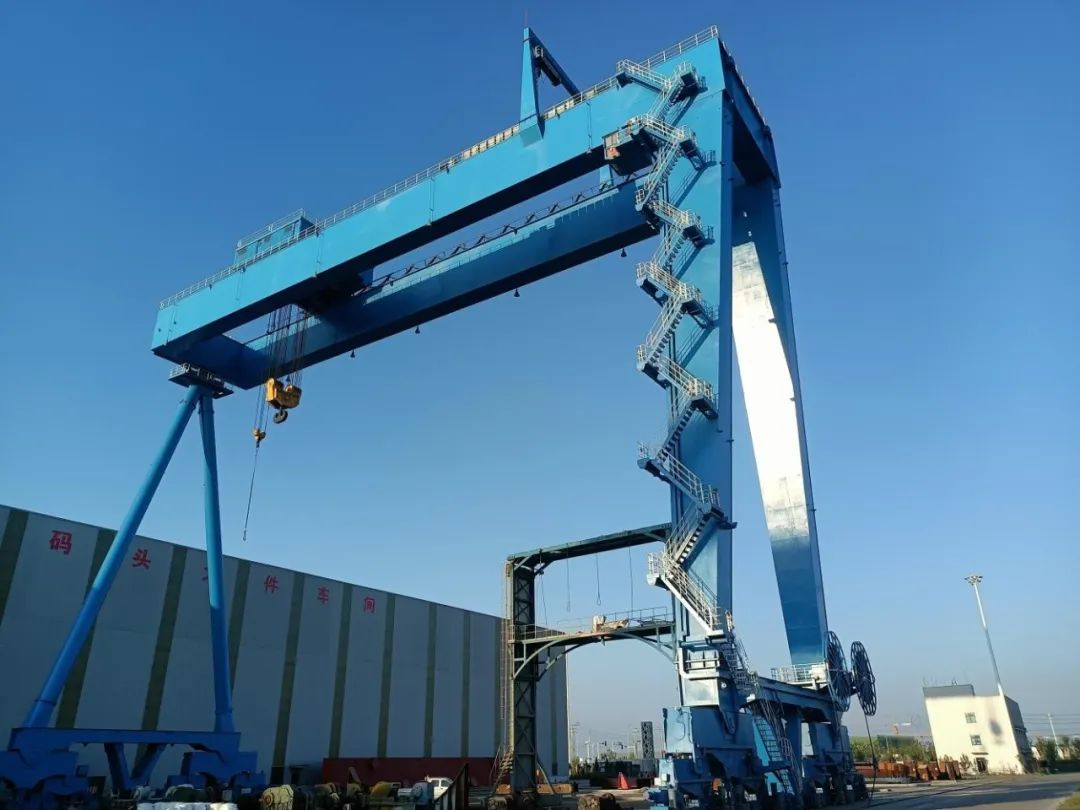 龙门式起重机(俗称龙门吊),是桥架通过两侧支腿支撑在地面轨道上的桥架型起重机。在港口,主要用于室外的货场、料场货、散货的装卸作业。它的金属结构像门形框架,承载主梁下安装两条支脚,可以直接在地面的轨道上行走,主梁两端可以具有外伸悬臂梁。龙门式起重机具有场地利用率高、作业范围大、适应面广、通用性强等特点,盐城响水重件码头额定负荷达到600T,能满足起吊几乎所有常见港口装卸物资。