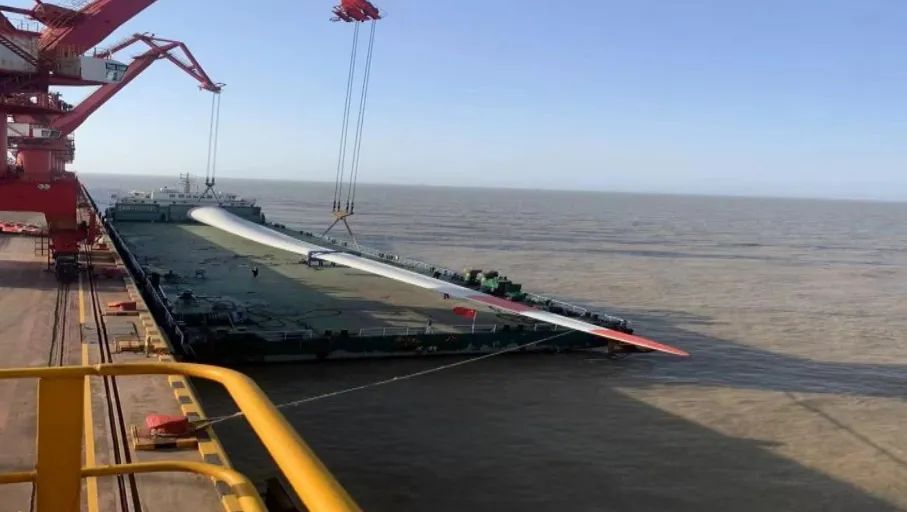 近日,在盐城港大丰港区通用码头2#泊位上演了一场风电叶片的吊装大片。两套116米巨龙般的风电叶片,随着吊装绳索稳稳吊放在“盛达98”轮甲板上,标志着本次风电叶片作业任务顺利完成,起航运往广西防城港。