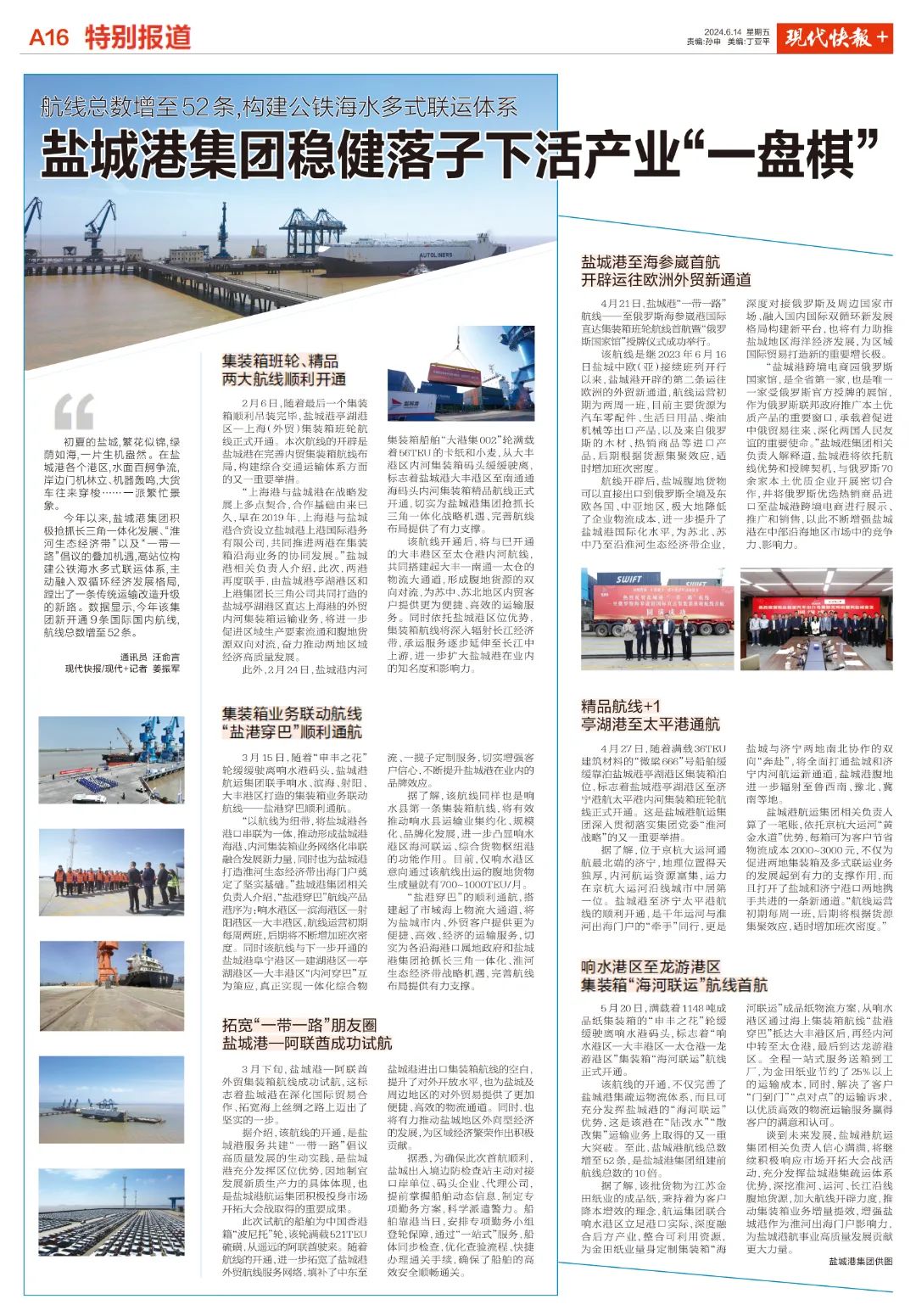 此外,2月24日,盐城港内河集装箱船舶“大港集002”轮满载着56TEU的卡纸和小麦,从大丰港区内河集装箱码头缓缓驶离,标志着盐城港大丰港区至南通通海码头内河集装箱精品航线正式开通,切实为海角社区 抢抓长三角一体化战略机遇、完善航线布局提供了有力支撑。