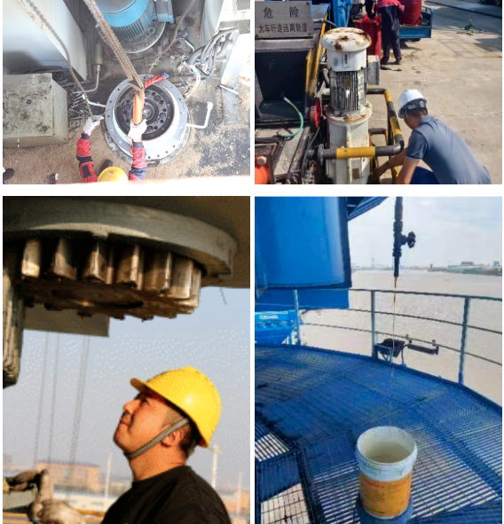 门机作为码头的重要设备,在港口装卸中发挥着主力军作用。然而,长期的工作负荷和恶劣的工作环境,使得门机减速箱齿轮油品出现乳化现象,导致润滑性能下降,齿轮箱内部部件易产生磨损、发热等问题,进而影响门机的正常运行。港区维修人员对门机所有起升、变幅和行走运作机构的减速箱进行检查,清理减速箱内部污垢,并根据生产作业时间,“见缝插针”式地开展油品更换工作,同时对电气系统进行了仔细检查,确保门机运行的稳定和安全。