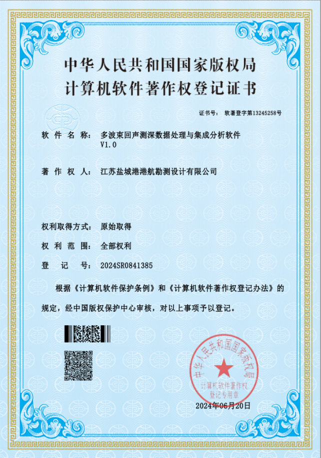 近日,根据《计算机软件保护条例》和《计算机软件著作权登记办法》的规定,经中国版权保护中心审核,盐城港港航勘测设计有限公司成功获取《多波束回声测深数据处理与集成分析软件V1.0》《水环境智能分析系统V1.0》《遥感数据自动化处理平台V1.0》三项软件著作权,数个专利申请也同步推进中。