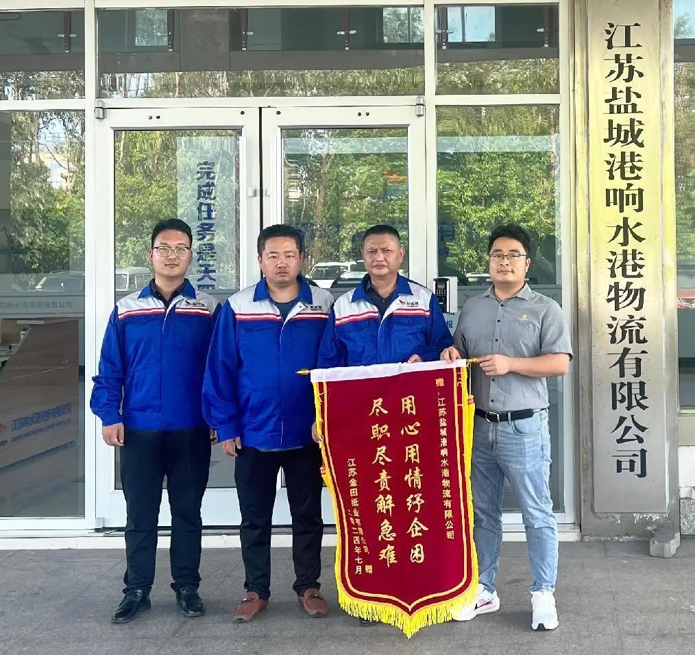 近日,盐城港响水港区物流公司收到江苏金田纸业有限公司赠送的“用心用情纾企困 尽职尽责解急难”锦旗,来表达对港区在成品纸运输期间优质服务的认可和感激之情。