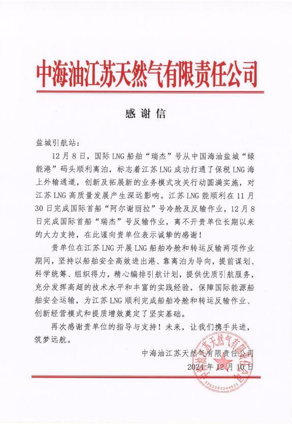 近日,盐城港引航站收到了一封来自中海油江苏天然气有限责任公司的感谢信,信中对盐城港引航站近期为江苏LNG船舶的安全高效运营及长期以来的优质服务表示衷心感谢。