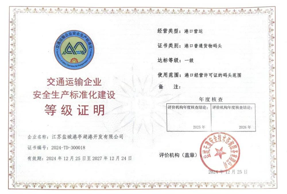 近日,陆港集团亭湖港区顺利通过交通运输企业安全生产一级标准化验收,并取得一级标准化认证证书。这标志着陆港集团在内河港区安全生产管理方面迈上新台阶。