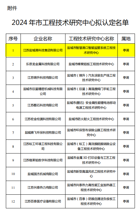 近日,盐城市科学技术局发布了《关于2024年盐城市工程技术研究中心认定名单》,其中科技集团成功入选,被认定为“盐城市智慧港口智能监管系统工程技术研究中心”。这一荣誉标志着科技集团在智慧创新领域上又迈出了坚实的步伐。