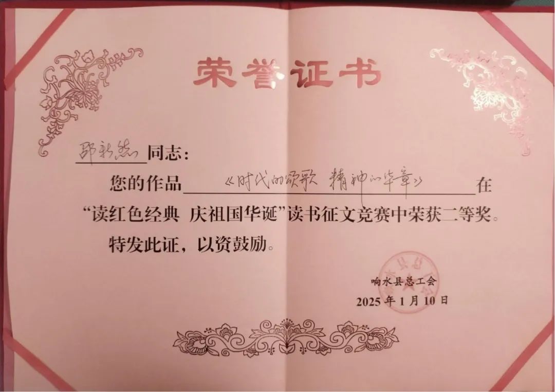近日,由响水县总工会举办的2024年度“读红色经典、庆祖国华诞”职工读书征文竞赛活动结果相继公布,江苏响水港物流有限公司业务组邵新然的《时代的颂歌,精神的华章》在众多作品中脱颖而出,荣获征文竞赛二等奖。