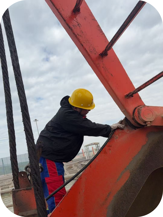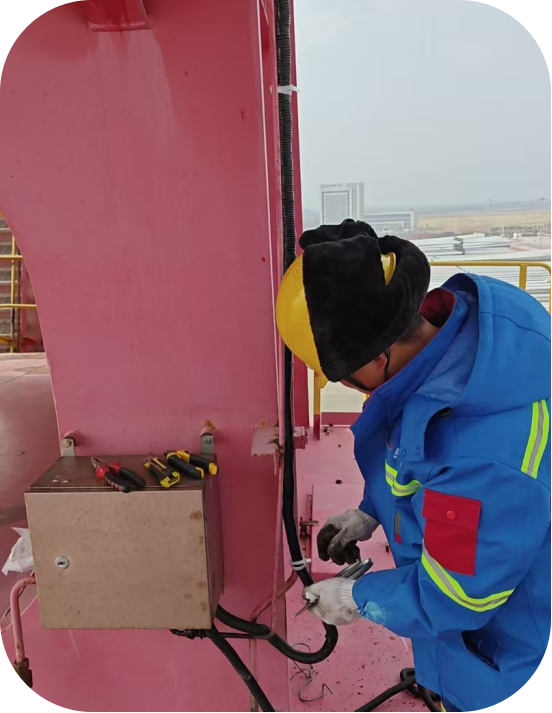 他攀至高耸门机顶端,低头细致检查设备,专注各部件运行健康状况。每一次低头,都是对设备安全的守护。