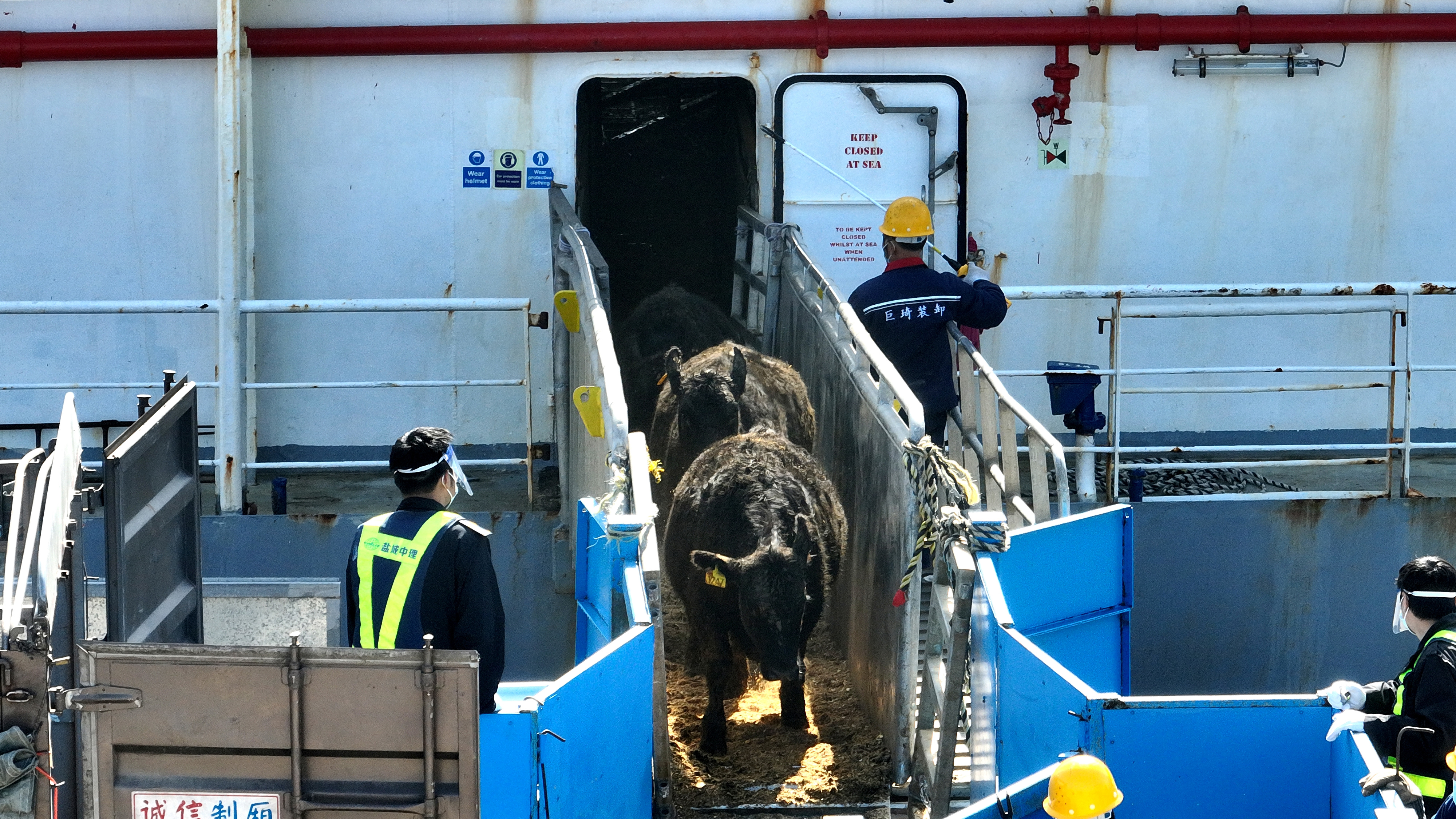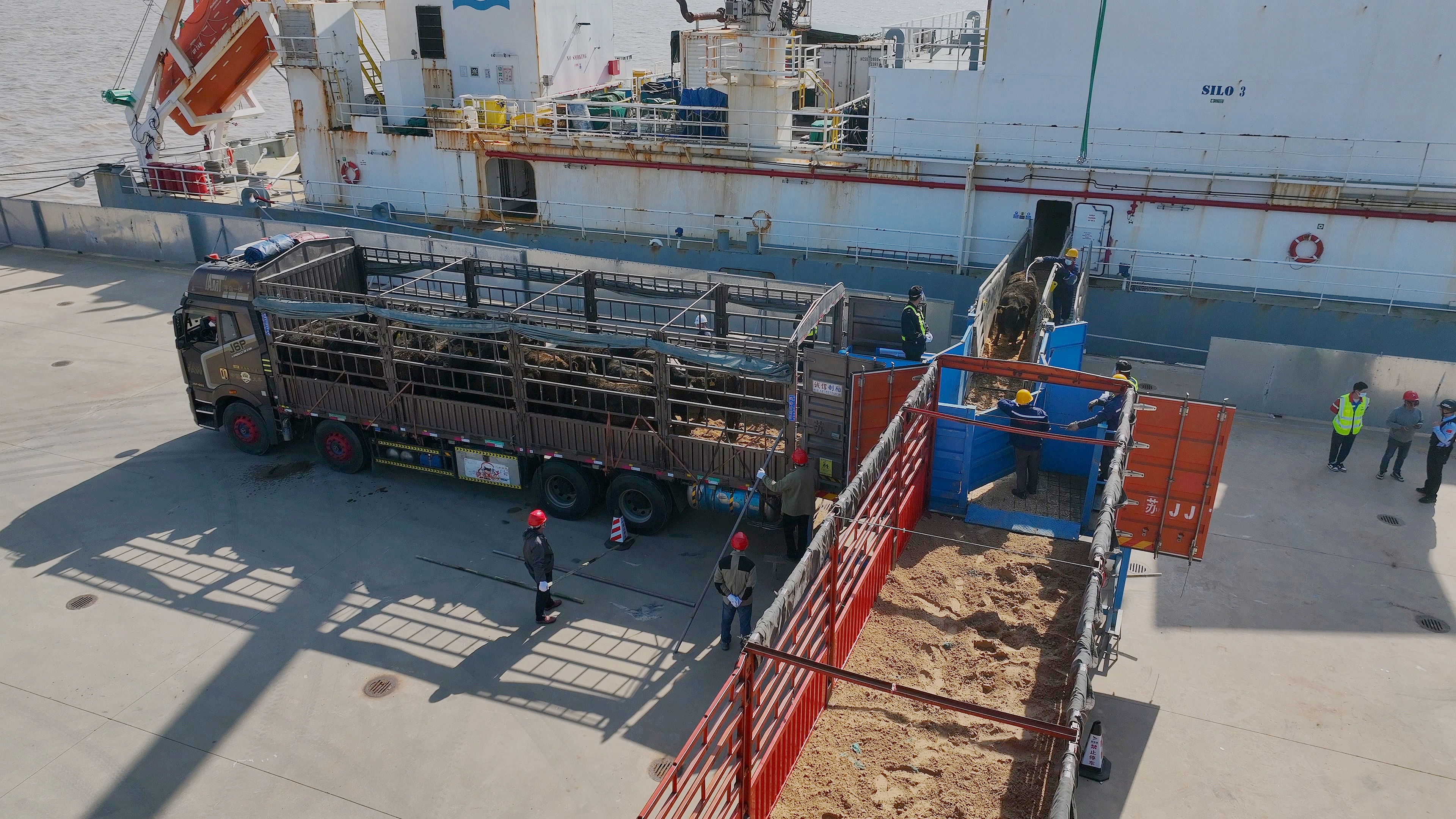 为最大程度减少活牛在运输过程中的应激反应,大丰港区与海关、边检、海事等口岸单位紧密协作,结合种牛装卸特点,重点围绕安全防疫、高效转运等环节,制定专项作业方案。一方面,科学调配骨干人员参与辅助作业,搭建专用接卸通道,划分作业隔离区域,采用“封闭通道、车船直取”模式,实现全程“零接触”转运,全力保证每一头种牛安全上岸。另一方面,组织专人实施监控,并提前敷设防滑材料防止种牛奔跑时滑倒受伤,及时对废弃物进行消毒清理,确保整个接卸过程高效环保,着力缩短接卸作业时间,有效提升了接卸服务质量。