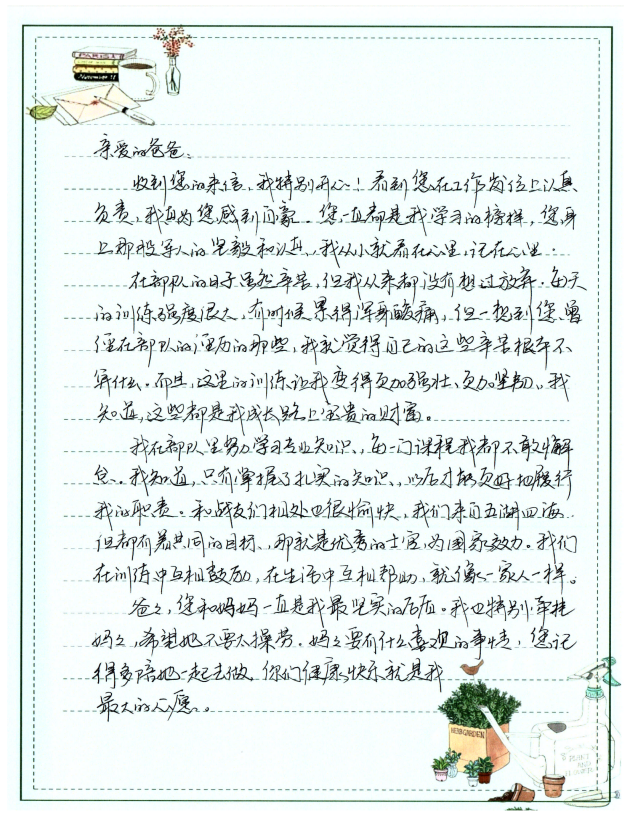 字里行间流露出对双亲的敬仰之情,细数在军旅或职场中的成长点滴,并郑重承诺将“忠诚、奋进”的家风薪火相传,以实际行动回馈家庭与社会,同时深切期盼家庭团聚的美好时光。