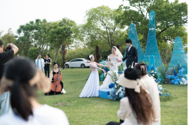 婚礼秀以“潮汐”“云端”为核心意象,将港口元素与婚礼艺术深度结合。室内环节通过宣传视频展现“吃住行游购娱”文旅产业链与酒店五星级服务理念,户外秀场则以大提琴演奏《有海浪声音的大提琴》、舞蹈《云与海的相遇》等沉浸式演出,打造“海风轻拂、云影婆娑”的梦幻氛围。新人登场时以“海港”“小云”为角色设定,誓言卡融入“潮汐的港湾”“穿越云海的勇气”等港口文化符号,让爱情叙事与港口特色交相辉映,营造出“海天共鉴”的浪漫场景。
