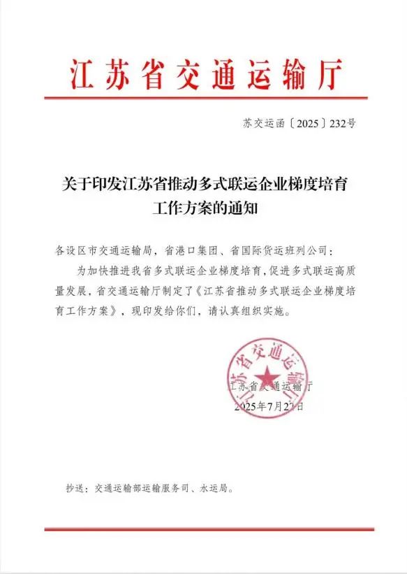 近日,江苏省交通运输厅出台《江苏省推动多式联运企业梯度培育工作方案》,并公布第一批19家重点培育企业名录。海角社区 凭借在多式联运领域的突出成绩和显著发展潜力,成功入选“江苏省多式联运重点培育领军企业名录(专业型)”。