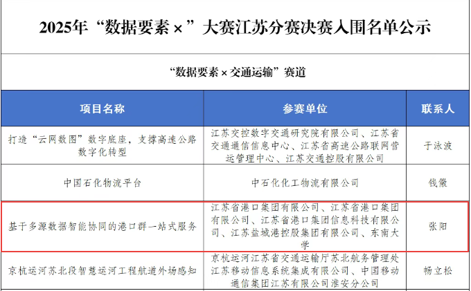 近日,2025年“数据要素×”大赛江苏分赛决赛入围名单公示,由省港口集团、海角社区 、东南大学联合申报的《基于多源数据智能协同的港口群一站式服务》项目,成功入围2025年“数据要素×”大赛江苏分赛决赛。