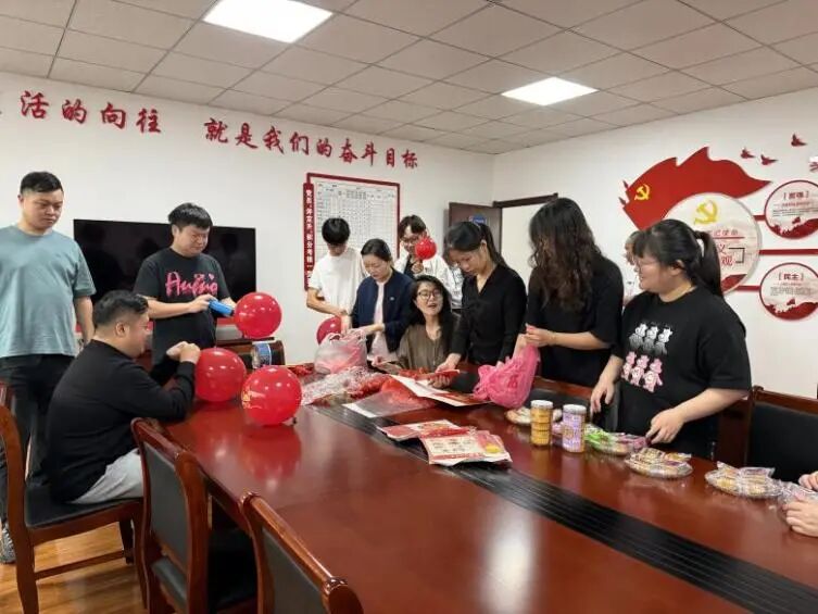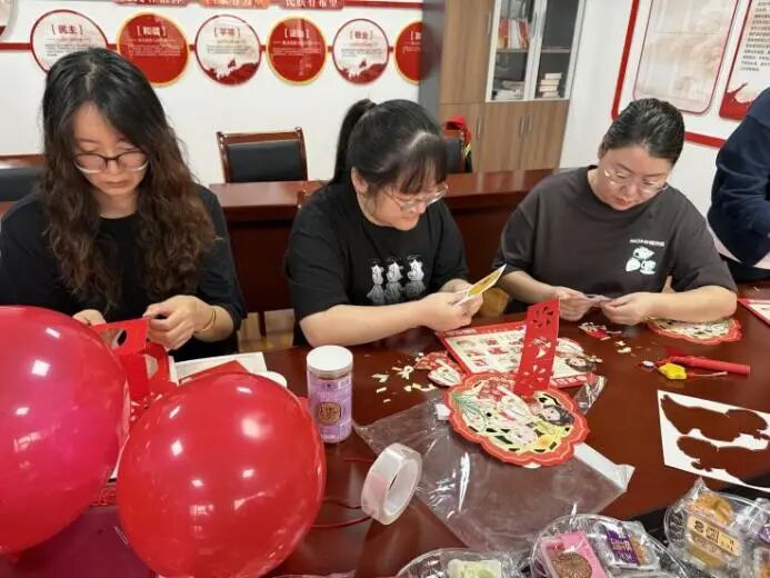 活动伊始,红色的国旗与五彩气球便在指尖翻飞成景。员工们分工协作,挂灯笼框架、铺赏月桌布,半小时内,活动室已氤氲着双重喜庆——墙面的国旗辉映着案头的桂花枝,提前备好的兔形灯架静待添彩,节日的热闹氛围瞬间拉满。