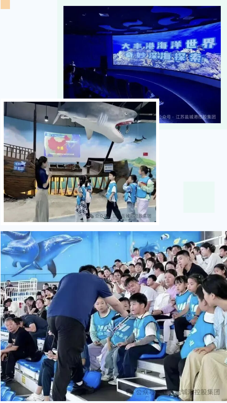 最后,孩子们踏入升级后的大丰港海洋世界科技馆,沉浸式体验瞬间拉满——VR实景秒变“海盗王”、5D星空影院带你“魂穿”深海秘境。“海洋世界寻宝”活动一开启,孩子们化身“寻宝小达人”,欢快穿梭在场馆内,“看,我找到一个”“耶!我找到两个”,欢呼声此起彼伏。讲解员以生动故事拆解复杂科学知识,让孩子们在互动中主动探索,实现“玩中学、学中悟”。海洋剧场内,主持人进行着海洋知识科普,训练员与聪明的海豚默契配合演绎着高空华尔兹,让孩子们在欢笑声中树立守护蓝色家园的意识。活动尾声,大家共同回顾全天收获,分享难忘瞬间,为这场研学之旅画上圆满句号。