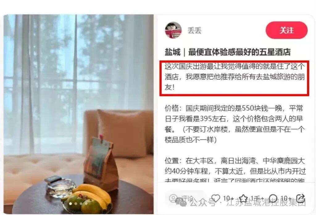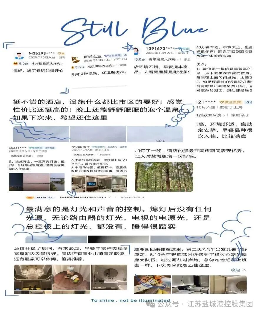 国庆期间,酒店各部门通力协作:后勤行政支援一线,参与餐饮服务、客房铺床、布草运送、质检等工作;前厅、中西餐厅、温泉馆、安保等服务岗位全员在岗,保障运营顺畅。游客在小红书、携程等平台留下的大量好评,成为这场攻坚中最珍贵的回响。一句“我愿意把他推荐给所有去盐城旅游的朋友!”不仅是认可,更是酒店与客人之间“双向奔赴”的最好见证。