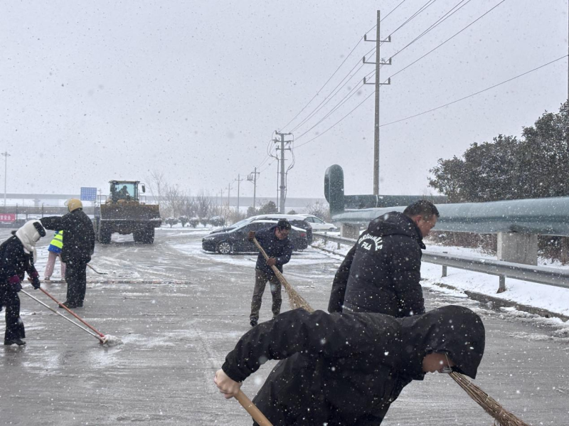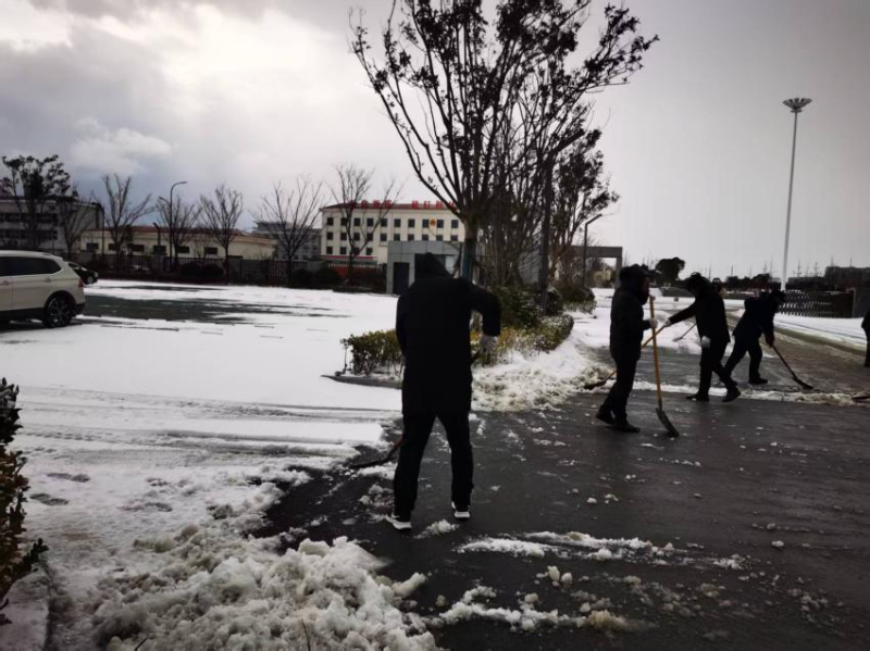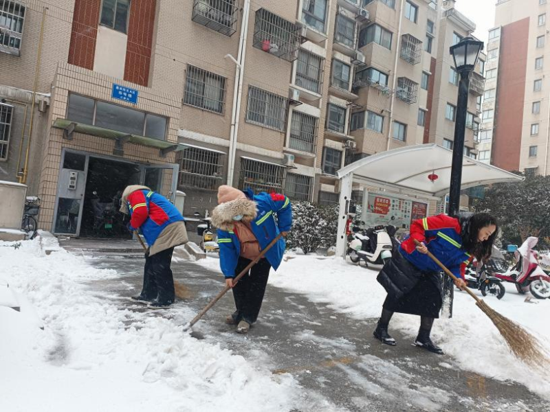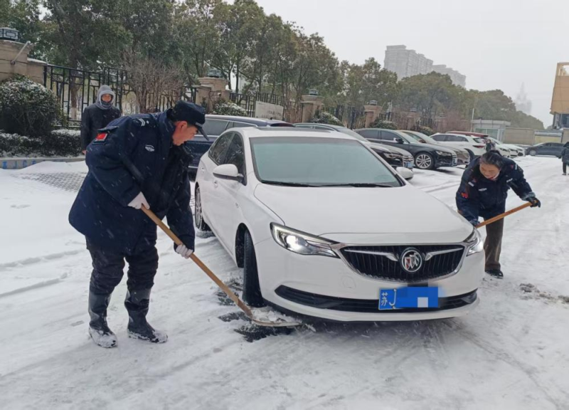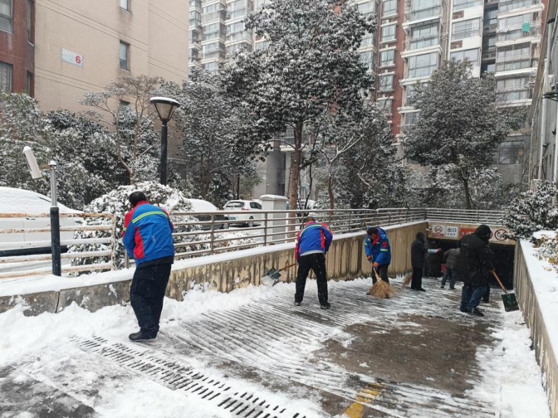 持续雨雪冰冻天气,气温骤降至零下,道路积雪结冰给群众出行和校园安全带来严峻考验。盐港物业第一时间响应,在居民小区,工作人员顶风冒寒,手持铁锹、扫帚在晨光熹微中集结,分工协作清扫楼门通道、地下车库坡道等关键区域。物业客服、保洁部门的女员工组成“巾帼除雪队”,清扫积雪后及时撒布融雪盐,用“巾帼不让须眉”的担当守护每一位业主的出行安全。面对业主车辆打滑被困的突发状况,工作人员火速上前,清扫冰雪、指挥调度,默契配合帮助车辆成功脱困,用及时援手传递服务温度。