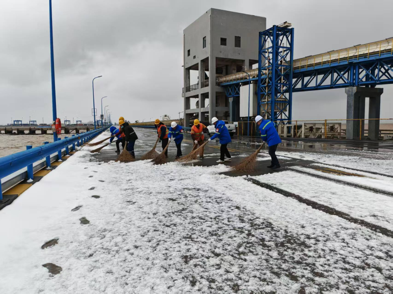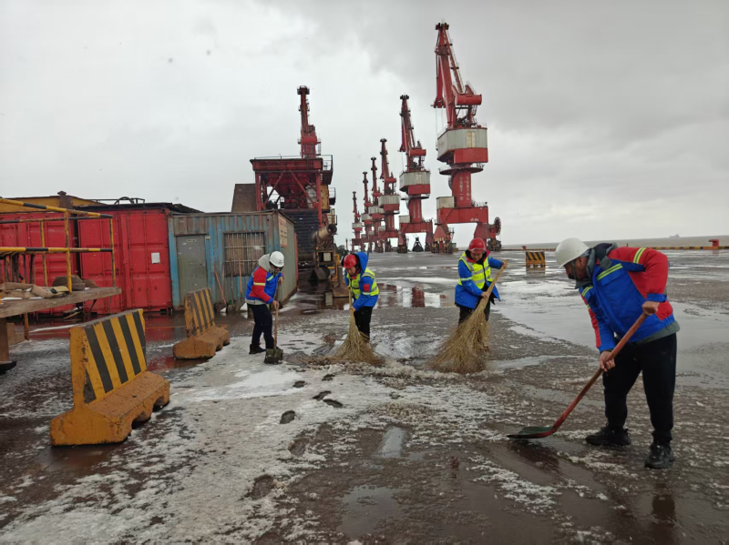 智慧港口公司迅速成立专项清雪除冰突击队,备足融雪剂、防滑垫等应急物资,采取“人工辅助、循环作业”模式,干部职工顶风冒雪清扫码头栈桥主干道,对边角缝隙、台阶坡道等机械作业盲区逐一清除积冰。党员干部扎根一线,加大巡查频次,在关键路段铺设防滑设施、喷洒融雪剂,实时排查安全隐患,操作人员严格遵守作业规范,穿戴防滑鞋、反光背心等防护用品,严守降速稳行要求,切实将“冬季五防”要求落到实处。
