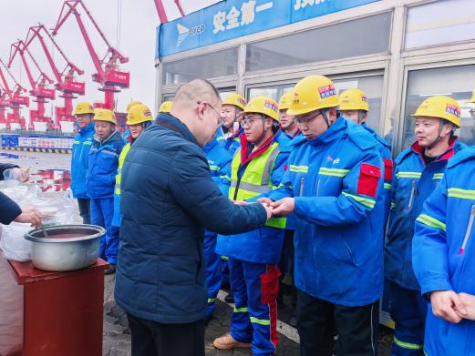 在射阳港区,凛冽海风裹挟着湿气,体感温度低至零下十余度。港区领导带领“暖心送粥队”穿梭于各个作业区,将精心熬制的腊八粥逐一送到在岗员工手中。为契合一线员工“寒夜坚守、高强度作业”的工作特性,港泊鹤湾酒店提前数日筹备,餐饮团队精选东北糯米、宁夏红枣、新疆核桃等十余种药食同源食材,特别添加燕麦、芡实等耐饥养胃原料,既遵循“七宝五味粥”传统古制,又强化了暖身抗寒功效。刚完成船舶系缆作业的员工们搓着冻红的双手围坐分享,滚烫的粥香不仅驱散了寒意,更映亮了一张张淳朴真挚的笑容。