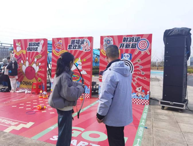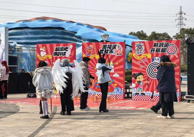 在潮流体验之外,景区传统年味氛围浓厚。海豚明星与驯养员共舞送福,趣味科普课堂传递海洋保护理念,马年元素与红色装饰遍布全场,“骐骥驰骋”的新春氛围拉满。外广场年味摊位热闹非凡,热饮零食随心选,套圈、射箭等民俗游戏趣味十足,工作人员全程互动,让传统年俗焕发新活力。