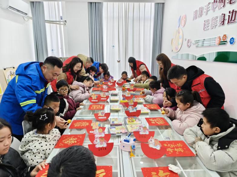 活动当日下午,在陈家港镇未成年人保护工作站的图书室里,20名留守儿童在志愿者的陪伴下认真阅读课外书籍,沉浸在书香之中。随后的游戏环节里,志愿者们与孩子们玩起击鼓传玩具的游戏,音乐声时而急促、时而舒缓,每当鼓声停下,拿到玩具的孩子便大方地说出一个带“马”字的四字词语,现场欢声笑语不断。在手工制作室,孩子们在志愿者的耐心指导下,动手粘贴马年玩具,并亲手拓印出金光闪闪的“福”字,感受传统文化的魅力。活动最后,响水港区志愿者们为孩子们发放了新年礼品和压岁红包,送上满满的新春祝福。