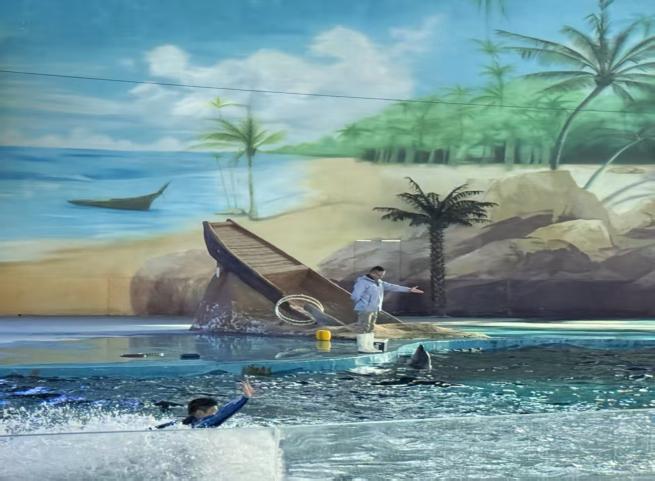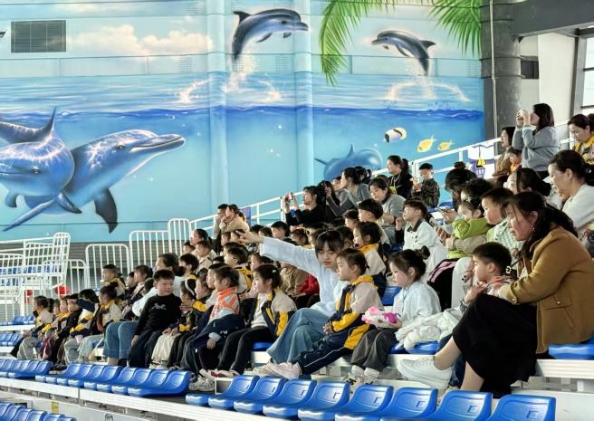 “老师,海豚会不会唱歌呀?”出发前,孩子们的问题就已装满一箩筐。带着满心好奇,下午时分,队伍一路欢歌抵达目的地。大手牵小手,小小的身影在海洋乐园前雀跃不止——“哇,这个房子是蓝色的,像大海一样!”“我要去看海豚!”稚嫩的惊叹声此起彼伏,瞬间唤醒了整个午后。