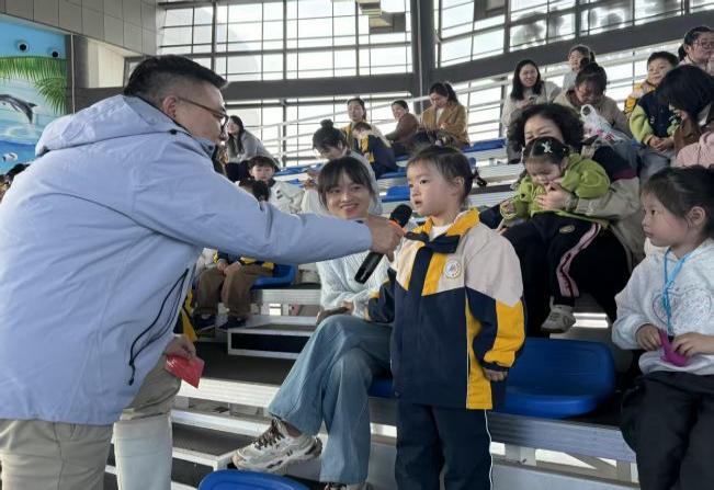 走进海洋剧场,一池碧水微漾。海豚循着驯养员的动作指令如闪电般破水而出,腾空、旋转、顶球、水中芭蕾……一气呵成,引得孩子们齐声欢呼:“哇!”演出间隙,科普讲解员抛出一个个小问题:“海豚有什么颜色呀?”小手齐刷刷举起,争先恐后:“有粉色、灰色、白色、蓝色……”,“好,那你们知道海豚用什么呼吸呀?”“鼻孔!”“不对,是头顶的呼吸孔!”——在阵阵笑声中,海洋的秘密悄悄住进了孩子们心里。