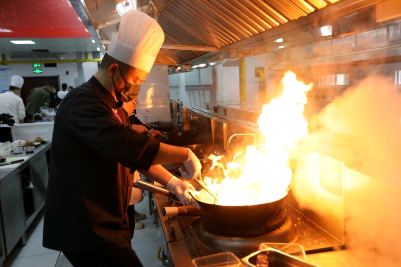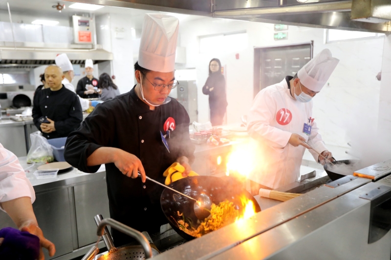 赛场内,整齐排列的操作台前,参赛选手精神抖擞、整装待发。随着开赛指令下达,现场立刻进入紧张有序的比拼状态。固定菜制作环节,统一配发的里脊肉与青椒在选手手中快速变身,刀刃起落间丝缕均匀,旺火翻炒中香气迸发,从油温控制到调味分寸,处处彰显扎实功底,每一步操作都严守餐饮规范、尽显专业素养。