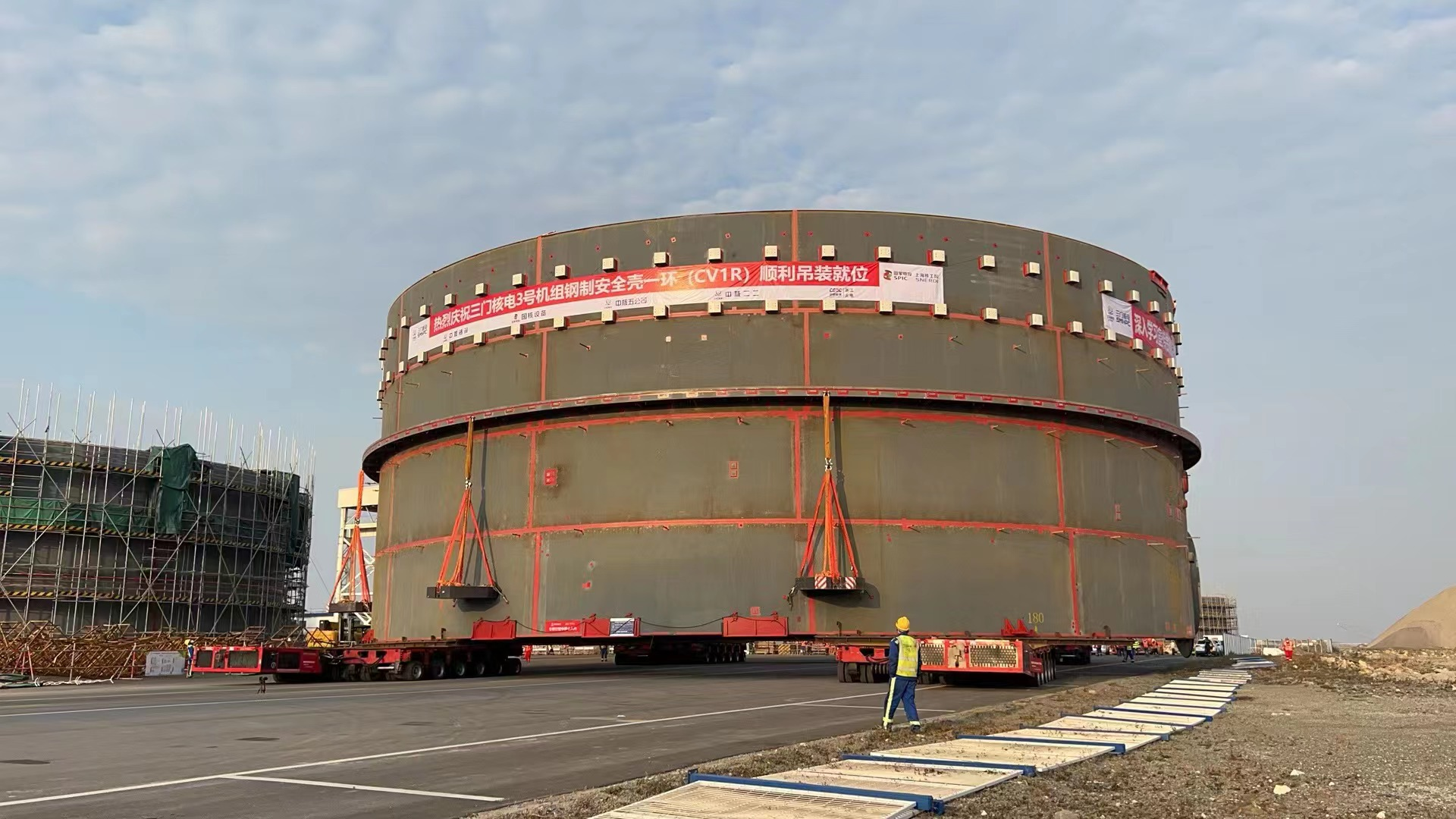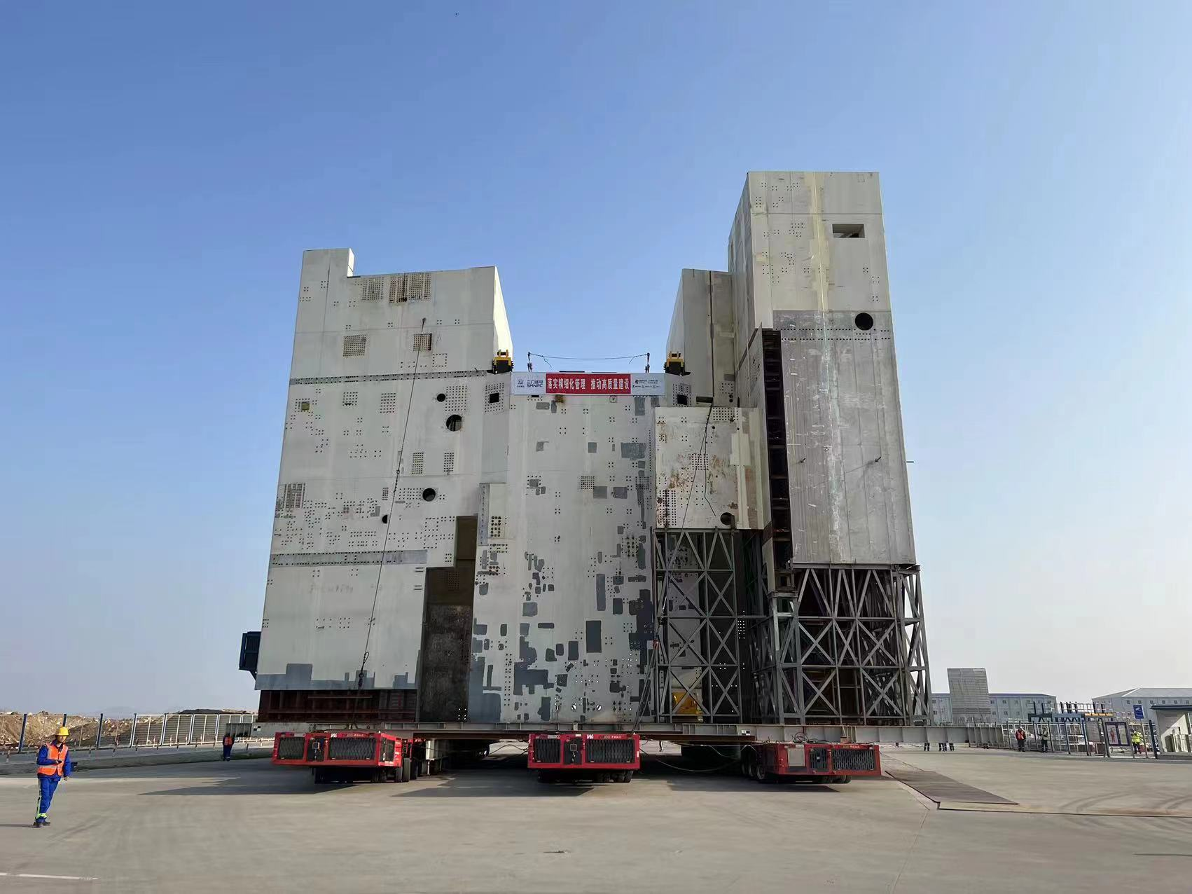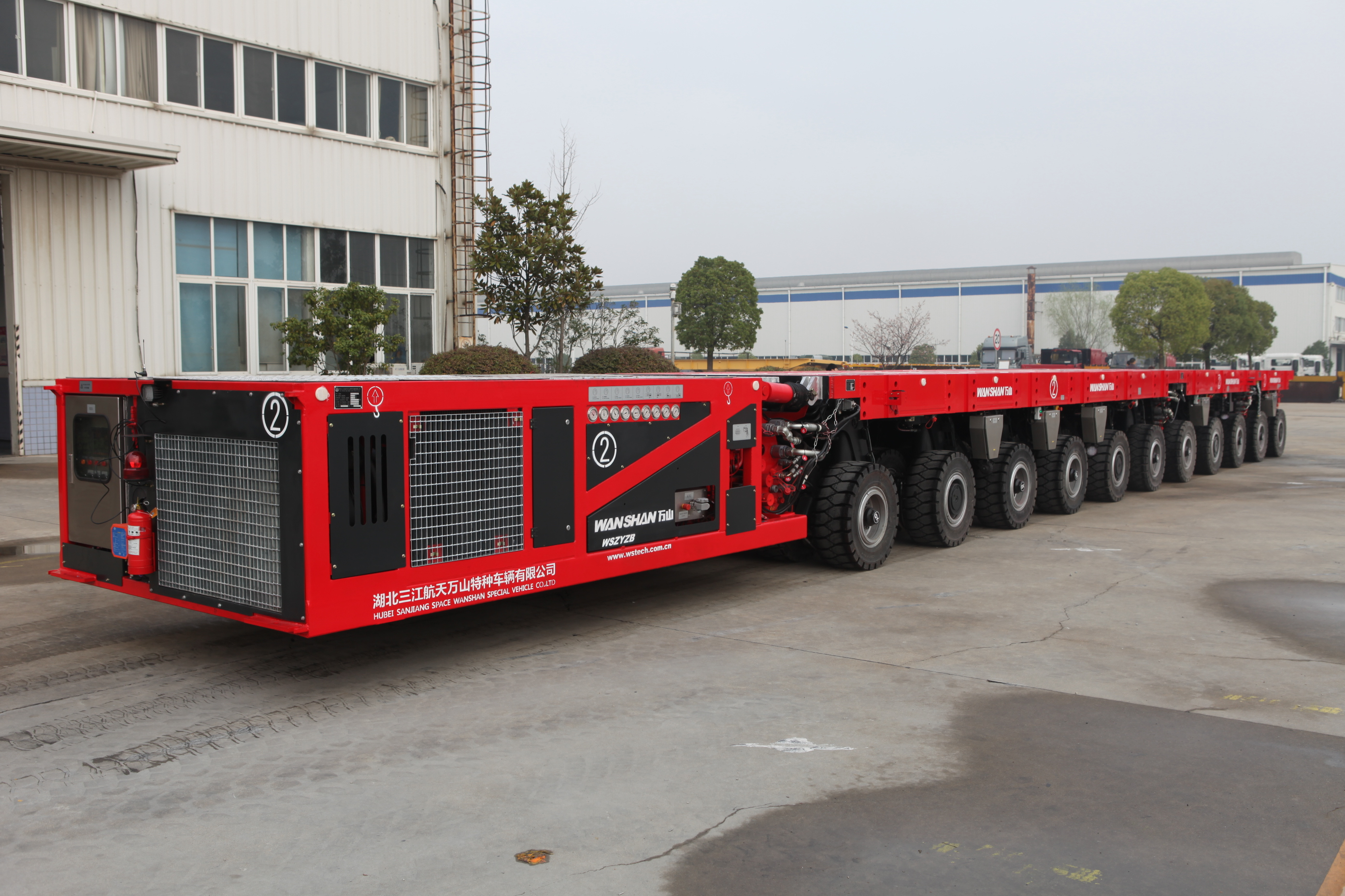 自行式模块运输车整车宽3m,由4套动力模块单元、8台模块单元车以及并车所需附件组合而成,共56轴线。此车配备了液压驱动、液压升降、液压转向的特种车辆,运输车整体长度可根据货物装载的需要,可将动力车组进行自由拼接,联动作业,可实现同步前进、倒退、原地转向、水平移动,堪称中国版“变形金刚”。此自行式模块运输车曾参加过国庆阅兵、三门核电设备运输等大型活动。